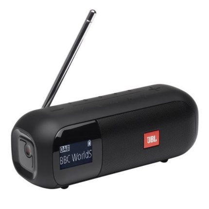 In the kitchen. By the pool. At the park. Now you can take your favorite DAB/DAB+/FM radio stations wherever the day takes you. The sleek JBL Tuner 2 is a compact, portable radio with crystal clear sound, Bluetooth, and 12 hours of playtime. Quickly tune to your favorite stations with 5 preset buttons and easy-to-read station information on the scrolling LCD display. It’s rated IPX7 waterproof and ready for the outdoors, so even in a sudden rainstorm, there’s no need to stress. Listen for hours. From news and weather in the morning to music and entertainment at night.